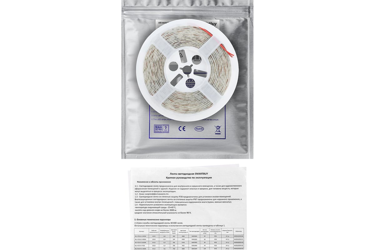 Двухслойная светодиодная LED лента SmartBuy сконструирована на базе светодиодов Epistar в корпусе 5050. Лента выпускается на гибкой печатной плате белого цвета шириной 8 мм и поставляется в катушках по 5 м. Каждая катушка с лентой SmartBuy укомплектована проводами для подключения к источнику питания. Срок службы светодиодной ленты Smartbuy составляет 30 000 часов.