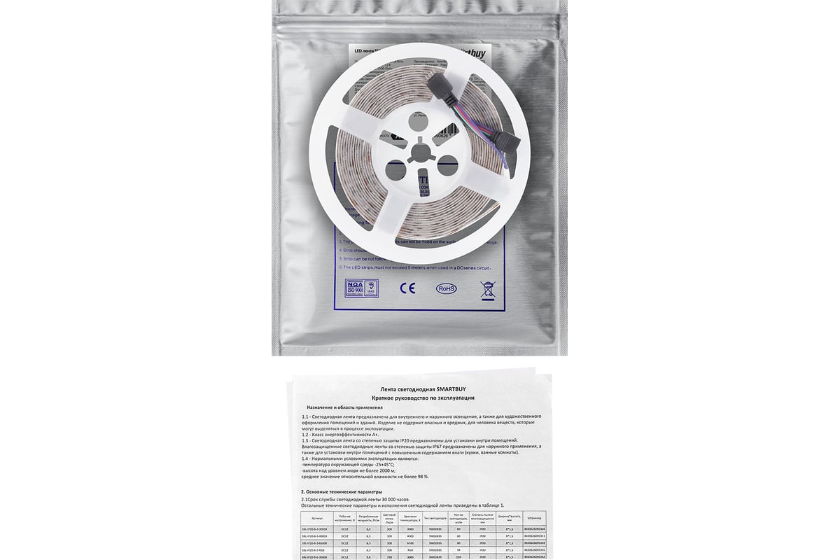 Двухслойная светодиодная LED лента SmartBuy сконструирована на базе светодиодов Epistar в корпусе 5050. Лента выпускается на гибкой печатной плате белого цвета шириной 8 мм и поставляется в катушках по 5 м. Каждая катушка с лентой SmartBuy укомплектована проводами для подключения к источнику питания. Срок службы светодиодной ленты Smartbuy составляет 30 000 часов.