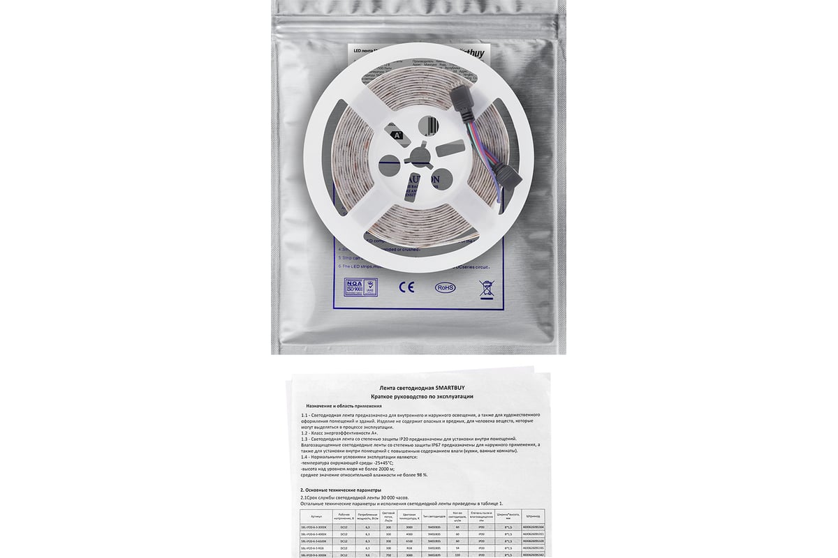 Двухслойная светодиодная LED лента SmartBuy сконструирована на базе светодиодов Epistar в корпусе 2835. Лента выпускается на гибкой печатной плате белого цвета шириной 8 мм и поставляется в катушках по 5 м. Срок службы светодиодной ленты Smartbuy составляет 30 000 часов.