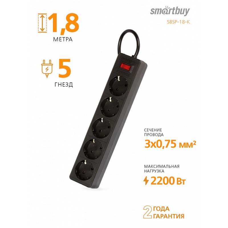 Сетевой фильтр Smartbuy, 10А, 2200Вт, 5 гнезд, без з/ш, земля, ПВС 3x0,75, 1,8 м, черный (SBSP-18-K)