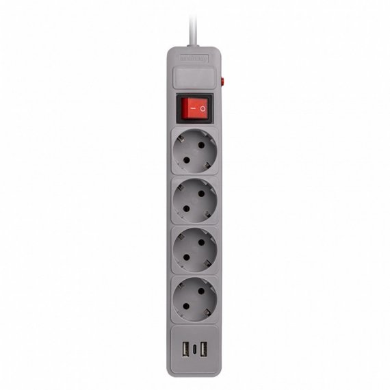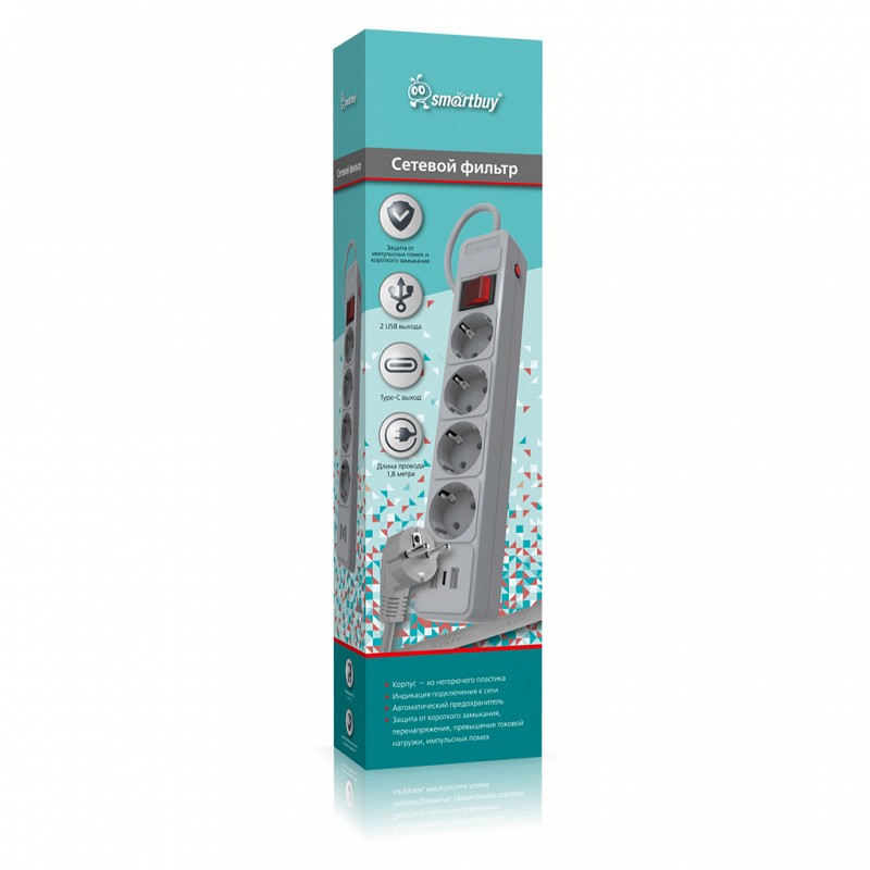 Сетевой фильтр c USB+Type C, 16А, 4 гнезда, c з/ш, с з/к, ПВС, 1.8 м, серый (SBSP-18C-G)