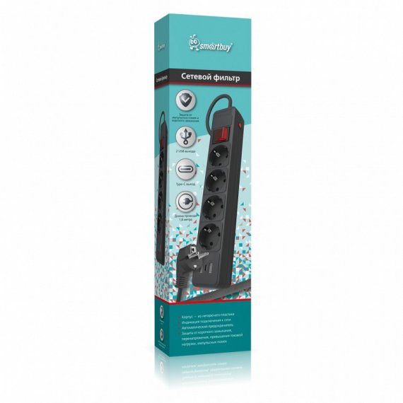 SMARTBUY сетевой фильтр SBSP-18C-K с 4 розетками и USB Type-C зарядкой идеален для безопасного подключения электроники. Защита от перепадов напряжения и перегрузки.