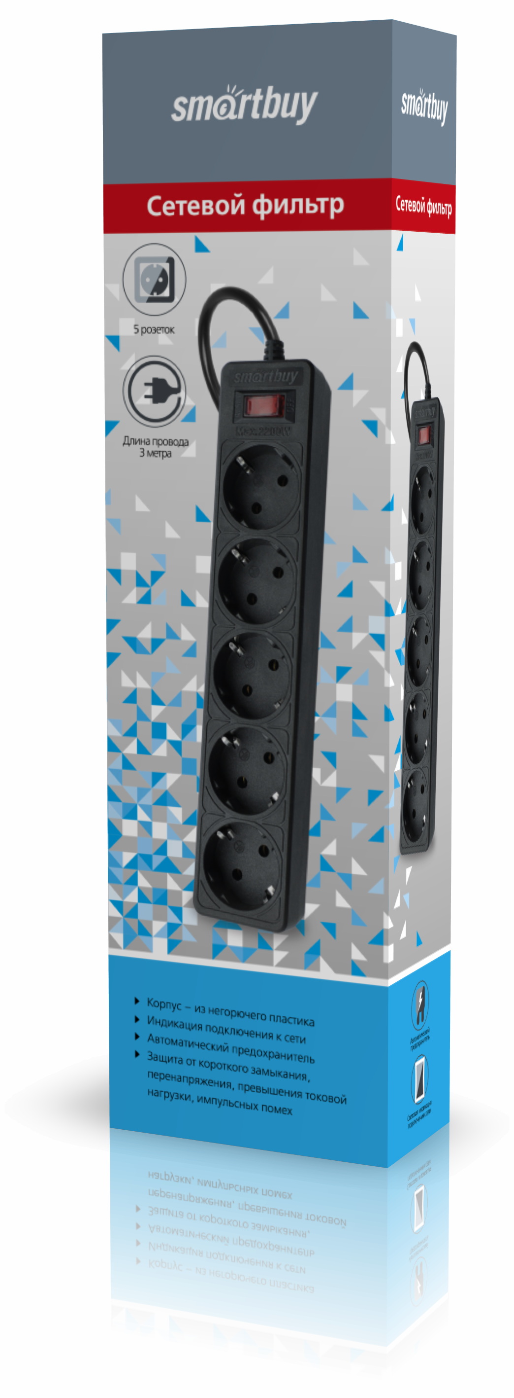 Удлинитель с функцией сетевого фильтра Smartbuy на 5 розеток для подключения широкого спектра компьютерной, офисной и бытовой техники к электросети 220В.