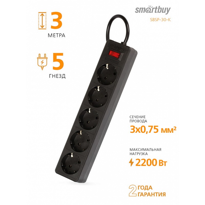 Smartbuy SBSP-30-K Сетевой фильтр, 10А, 2200 Вт, 5 гнезд, без з/ш, земля, ПВС 3x0,75