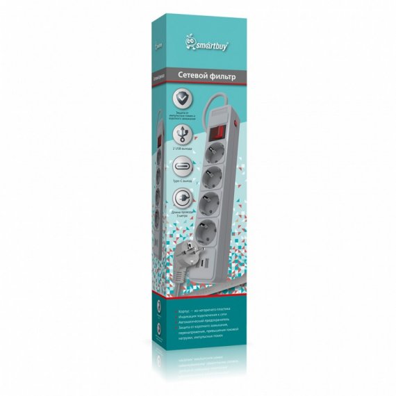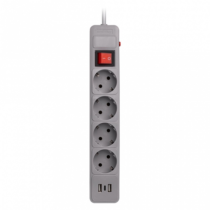 Smartbuy SBSP-30C-G Сетевой фильтр c USB+Type C, 16А, 4 гнезда, c з/ш, с з/к