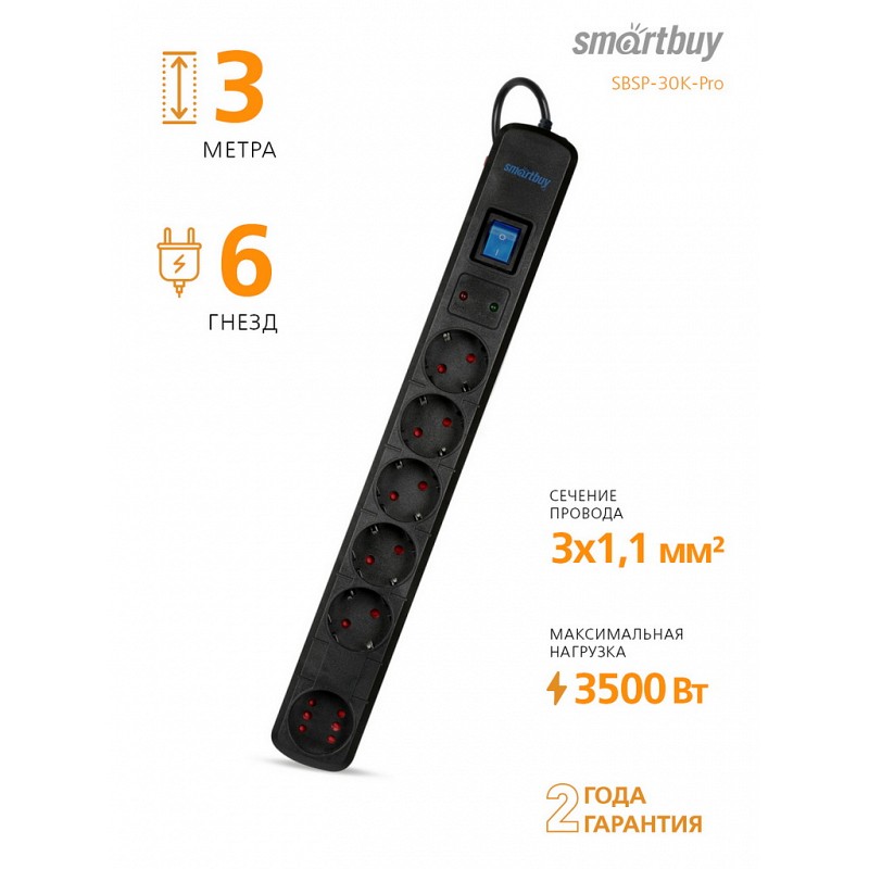 Smartbuy SBSP-30K-Pro Сетевой фильтр, 16А, 3500 Вт, 6 гнезд, с з/ш, земля, ПВС