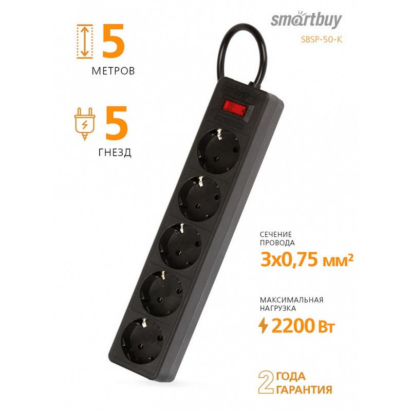 Smartbuy SBSP-50-K Сетевой фильтр, 10А, 2200 Вт, 5 гнезд, без з/ш, земля, ПВС 3x0,75