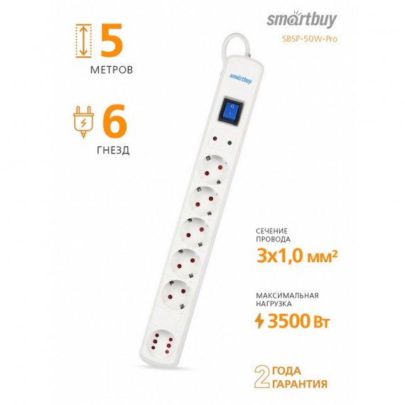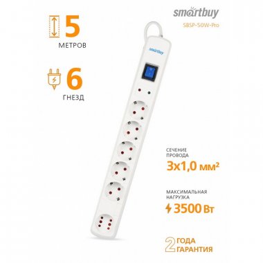 Smartbuy SBSP-50W-Pro Сетевой фильтр, 16А, 3500 Вт, 6 гнезд, с з/ш, земля, ПВС