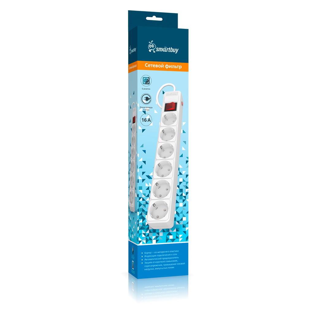 Сетевой фильтр от компании SMARTBUY. Мощность 3500Вт, номинальный ток 16А. Оснащен 6 гнездами и имеет длину кабеля 3 метра. Корпус выполнен в белом цвете.