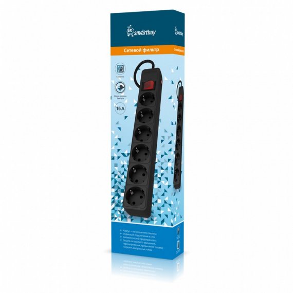 Сетевой фильтр SMARTBUY обладает мощностью 3500 Вт и номинальным током 16А. Он оснащен 6 розетками и имеет длину кабеля 5 метров. Продукт выполнен в черном цвете.