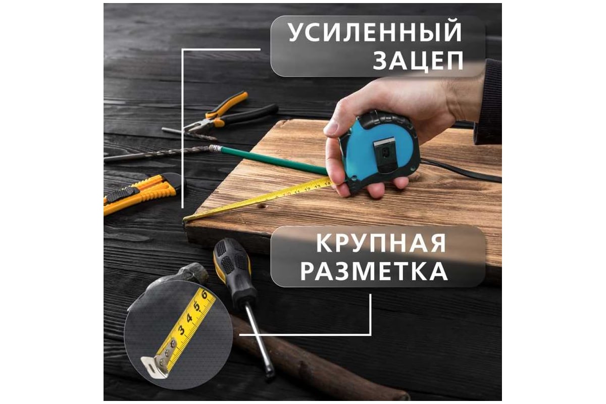 Рулетка измерительная Smartbuy 10мх25мм представляет собой надежный инструмент для бытового использования. Она оснащена прочной стальной лентой длиной 10 метров и шириной 25 мм, что обеспечивает удобство и точность измерений. Корпус рулетки выполнен из обрезиненного пластика, что делает его устойчивым к механическим повреждениям и обеспечивает комфортное удержание в руке. Эргономичная форма корпуса способствует удобству использования, а усиленный зацеп гарантирует надежное закрепление ленты на измеряемой поверхности. Разметка нанесена краской, что обеспечивает хорошую видимость и долговечность. Рулетка не требует батареек, что упрощает ее эксплуатацию. Этот инструмент идеально подходит для выполнения различных измерительных задач в домашних условиях.