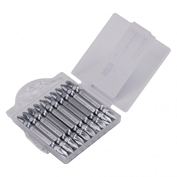 Набор бит изготовлен из стали тип S2. Благодаря этой стали, биты обладают повышенной стойкостью к повреждениям, и наделены большим сроком службы. На битах есть насечка для защелкивания в патронах, а также есть двухсторонние шлицы, при необходимости можно заменить сторону.