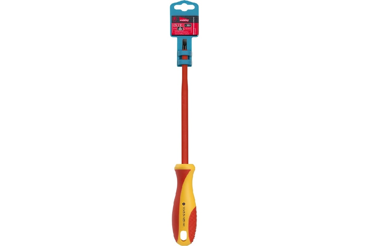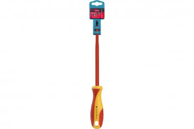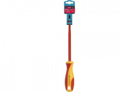 Диэлектрическая шлицевая отвертка Smartbuy SL5.5x125, до 1000 В, VDE SBT-SCI-SL55x125P1 используется для работ с крепежом при различных электромонтажных и ремонтных работах. Отвертка позволяет проводить работу с проводниками, в которых по той или иной причине нельзя отключить питание, например, отрегулировать затяжку винтов входной группы автоматического выключателя, или подключить патрон лампы к включенному участку цепи. Наконечник отвертки выполнен из качественной стали с твердостью свыше 51 единиц по шкале Роквелла. Это обеспечивает высокую прочность и долговечность. Отвертка может выдерживать напряжение до 1000 В.