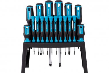 Комплект наиболее популярных размеров отверток для дома. Хром-ванадиевая сталь, эргономичная двухкомпонентная рукоятка позволит работать с крепежом, даже залитым краской и заклинившим. Шлицы соответствуют ГОСТ, треугольная рукоятка обеспечивает больший вращательный момент. Низкая цена. Удобный пластиковый подвес-подставка, чтобы ничего не потерялось