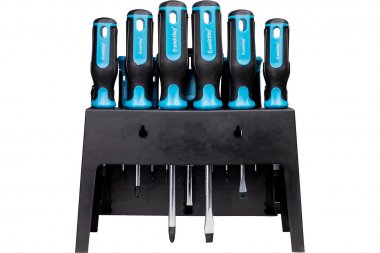 Комплект наиболее популярных размеров отверток для дома. Хром-ванадиевая сталь, эргономичная двухкомпонентная рукоятка позволит работать с крепежом, даже залитым краской и заклинившим. Шлицы соответствуют ГОСТ, треугольная рукоятка обеспечивает больший вращательный момент. Намагниченные наконечники отверток для работы с крепежом даже одной рукой. Низкая цена. Удобный пластиковый подвес-подставка, чтобы ничего не потерялось.