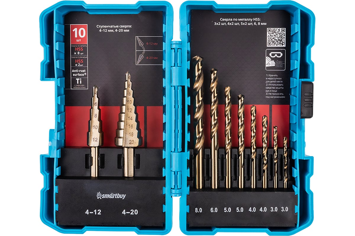 Набор сверл 10 штук, 3-8 мм, ступенчатые сверла 4 -20 мм, HSS 4241 титан.покр., кейс, Smartbuy Tools