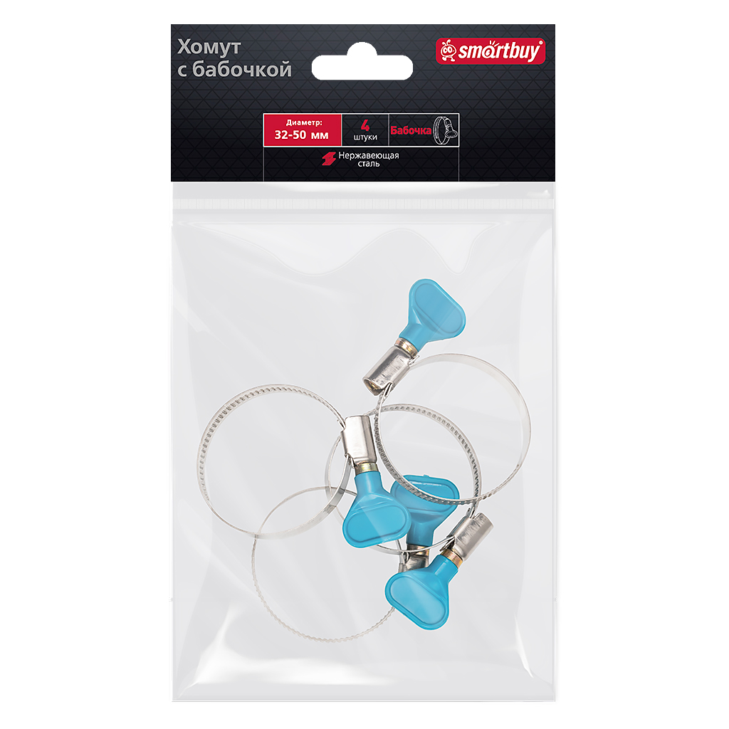Хомут 32-50 мм, 4 шт, с бабочкой, нерж. сталь, Smartbuy Tools