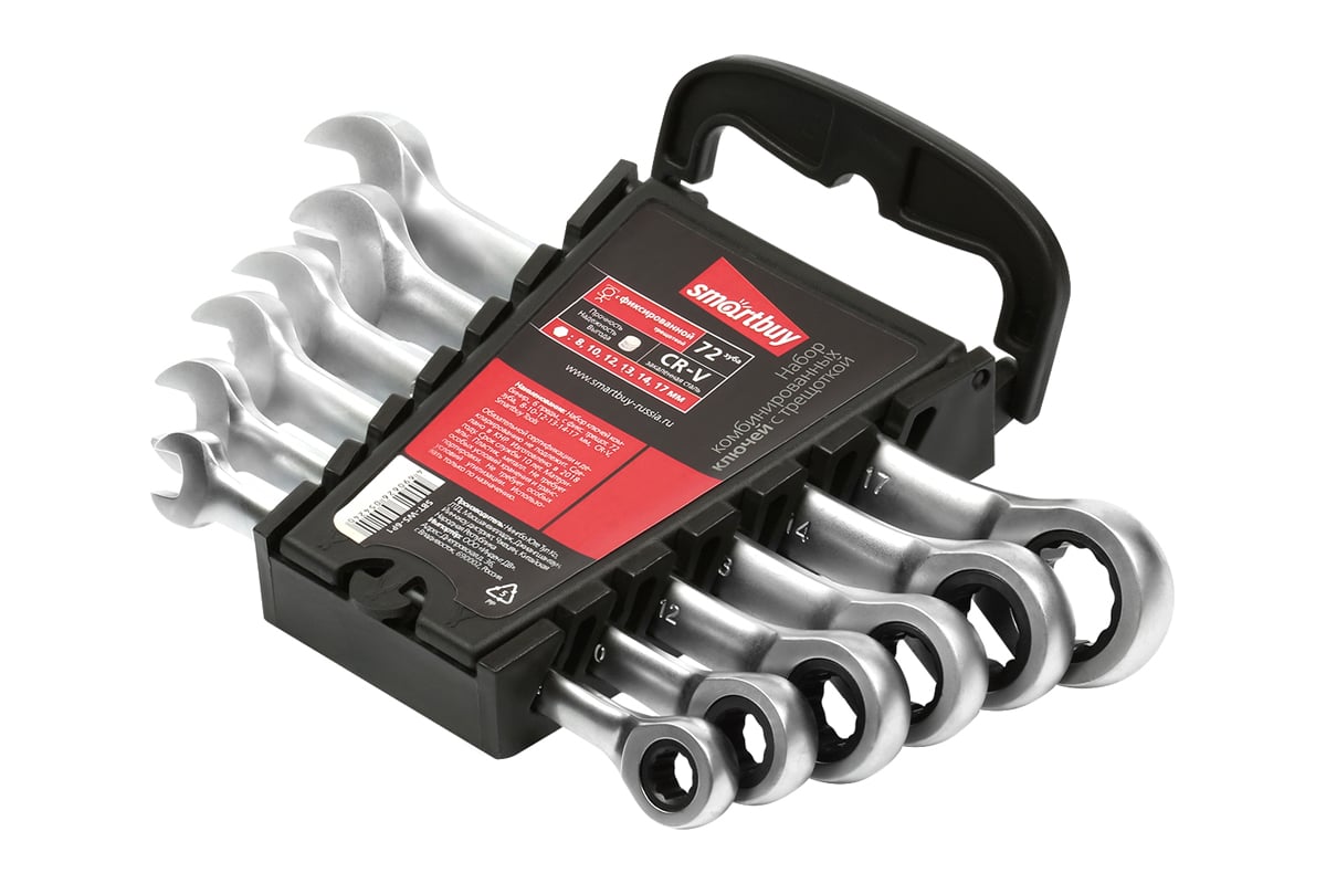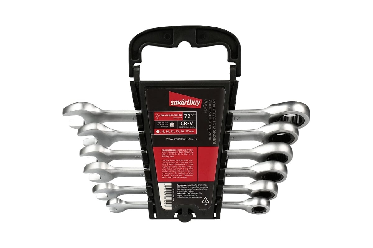 Набор комбинированных ключей Smartbuy 6 предметов, с фиксированной трещоткой 72 зуба, 8-10-12-13-14-17 мм SBT-WS-6P1 облегчают работу в обычных и труднодоступных местах, если требуется производить работу по демонтажу крепежа. Трещотка на одной стороне ключа позволяет не переставлять ключ при демонтаже, если требуется совершать повторяющиеся действия.